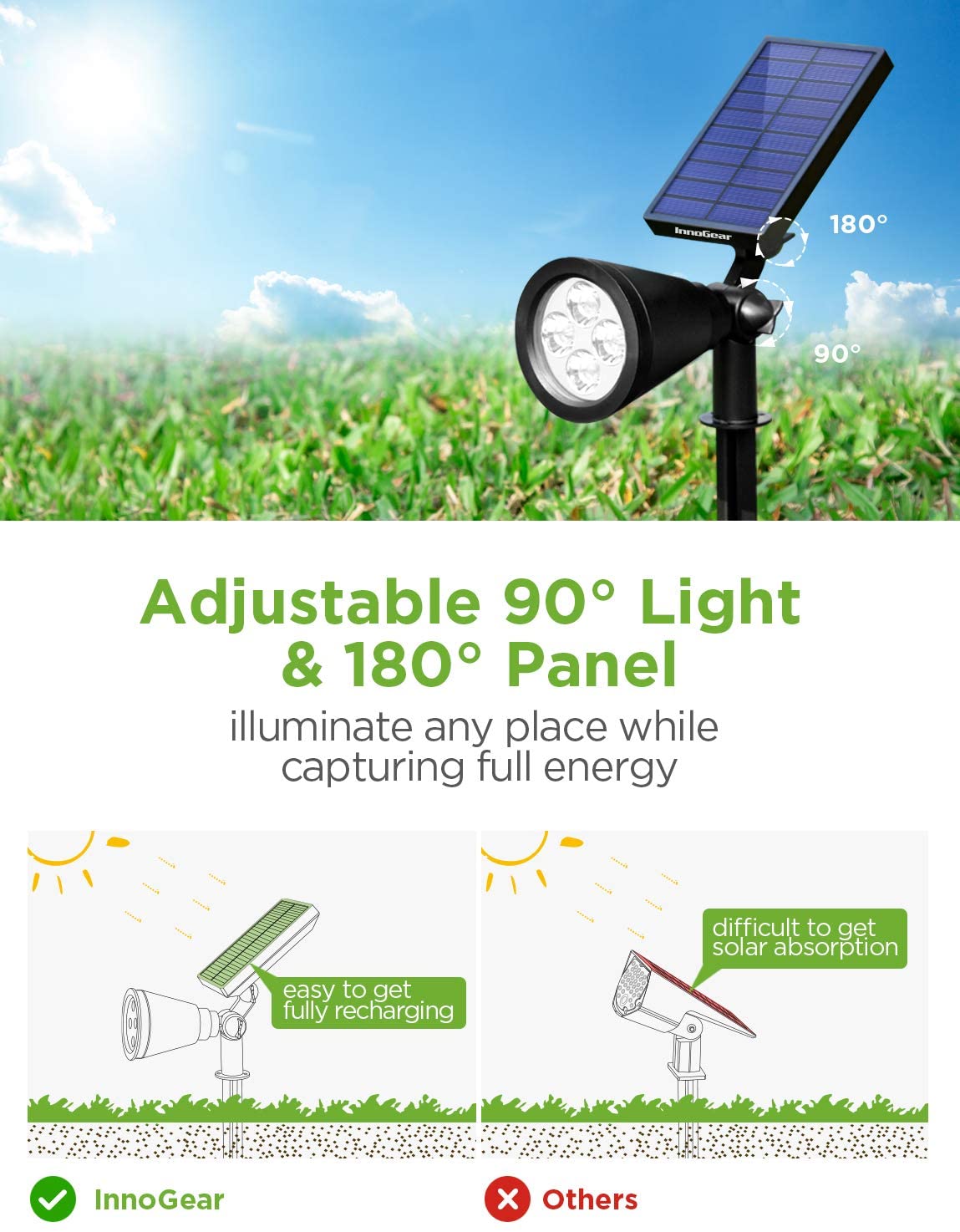 The solar-powered spotlight can be adjusted to 90° to illuminate any outdoor space. The solar panel can be adjusted to 180° for optimal sunlight exposure.