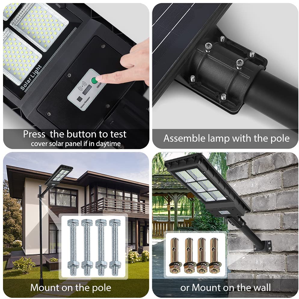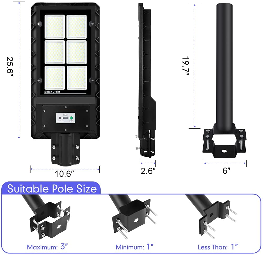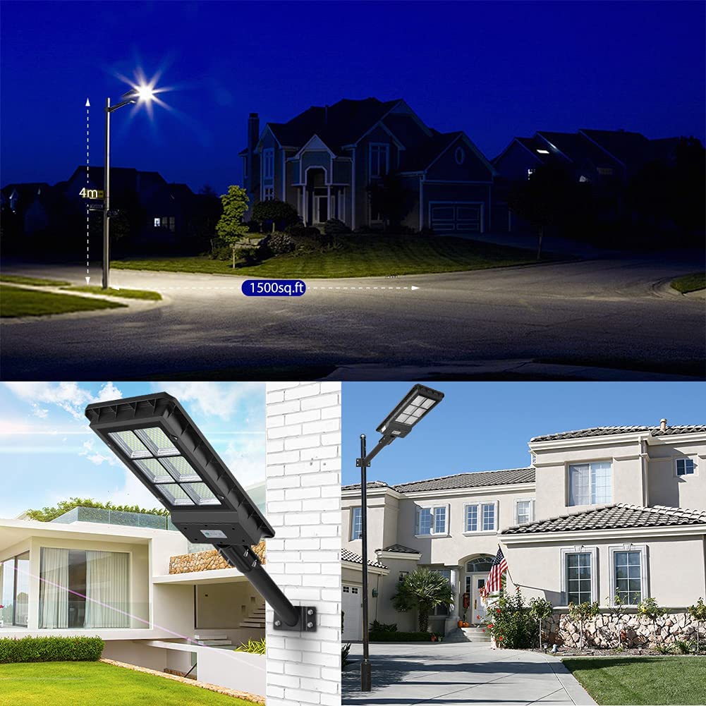 This Monocrystalline Silicon LED Solar Street Light is very bright with 330 LED lights. It has a wide-angle lens and can provide coverage of up to 3000 square feet (8 meters high). We recommend mounting it on poles 4 to 8 meters high and 7 to 10 meters apart. In addition, our solar safety light is equipped with monocrystalline silicon solar panel, the light energy conversion rate is 30% higher than other ordinary solar panels, and it can work normally even on cloudy days. And it charges faster: After 6 hours of charging, it works for up to 10 hours in full light mode and over 36 hours in dark mode.