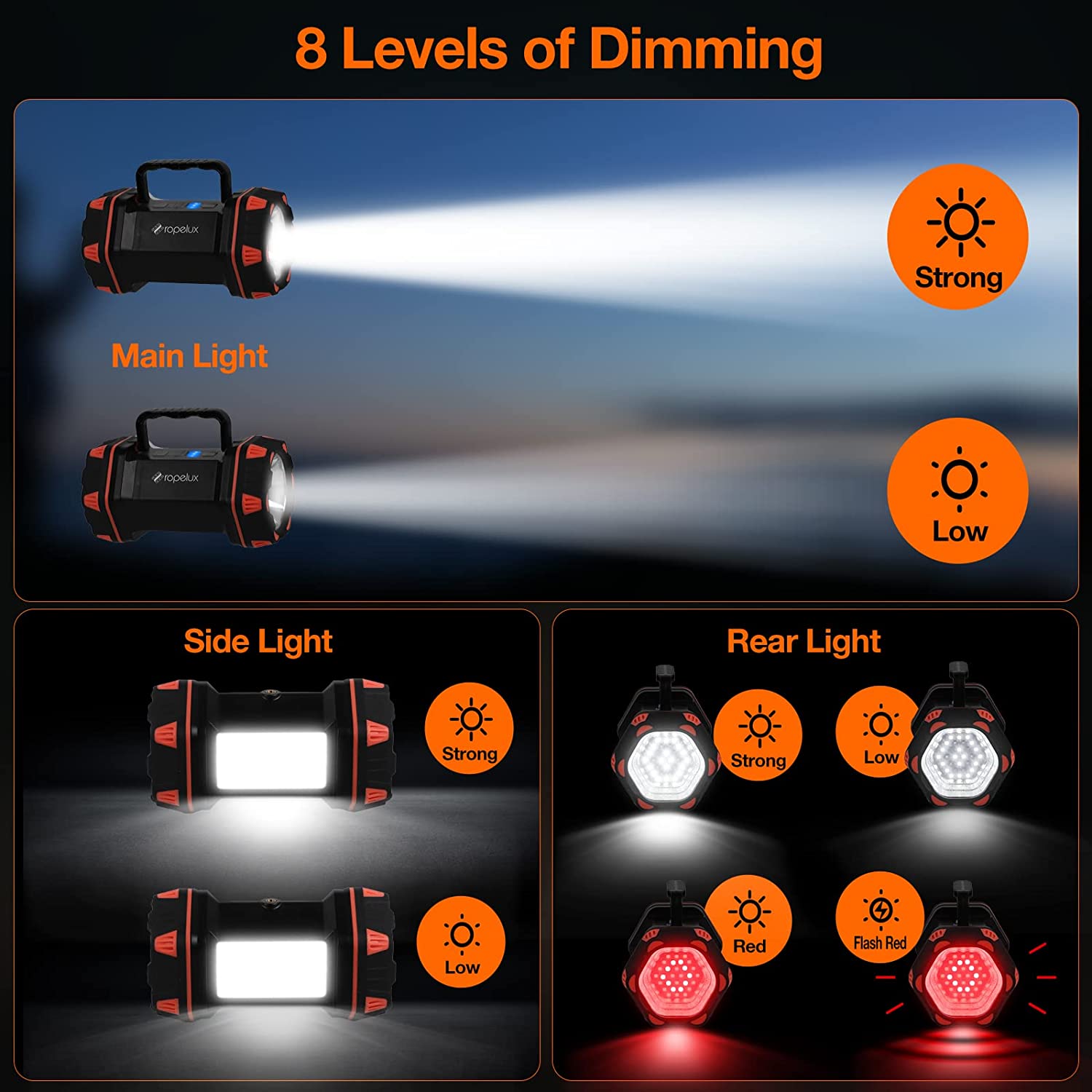 LIGHTS MODES-This setting up wholesale led work light battery-powered has front, Back light heads and side lights and a sum of 8 lighting modes. Principal light has 2 light modes(high,low), Suitable for all over lighting. Taillight has 4 modes (high,low,red,red strobe), appropriate as a crisis light. Side floodlight are 2 modes(high,low), which can be utilized as a setting up camp light.
