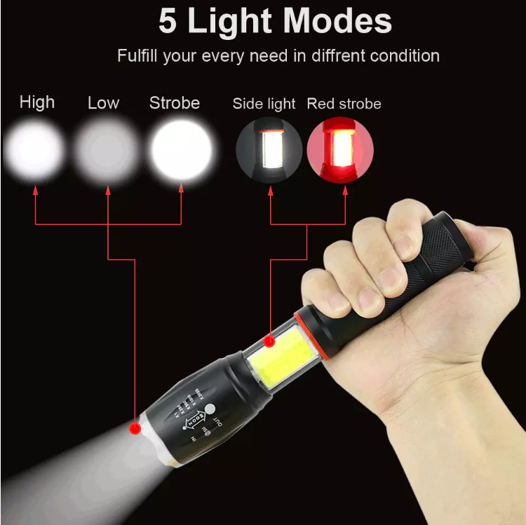 COB Zoomable Flashlight has Super 5-Function, high low strobe side light red strobe, which can be used in various scenarios.