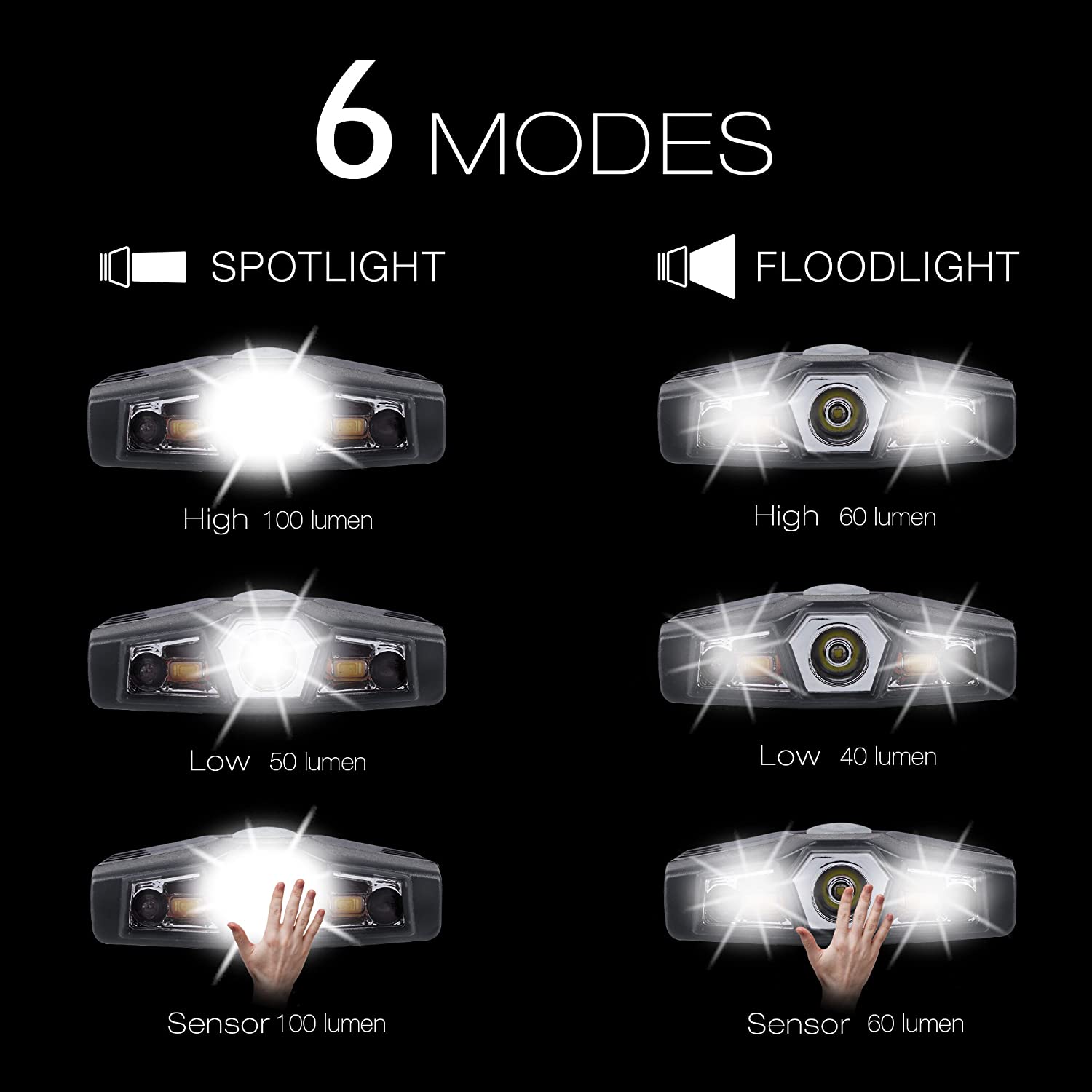 ✔ 6 modes – Spotlight (high 100 lumens / low 50 lumens), floodlight (high 60 lumens / low 40 lumens), motion sensor (Spotlight 100 lumens / floodlight 60 lumens).