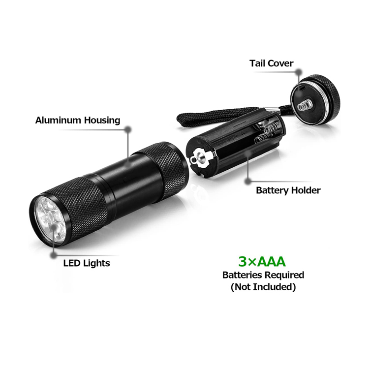 Multiple colors: non slip handle with lanyard for safe holding. Durable aluminum body. 9 LED flashlights of various colors: blue, red, silver, black, gray and green.
