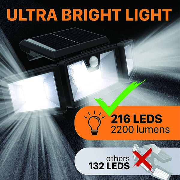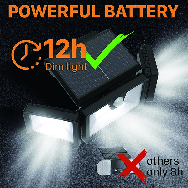 With up to 2200LM of lumens, this Outdoor Solar Security Lights can perfectly illuminate your backyard. It has 3 light panels and 1 solar panel, and the unique design charges during the day, allowing you to experience the same wonderful vision at night as during the day.
