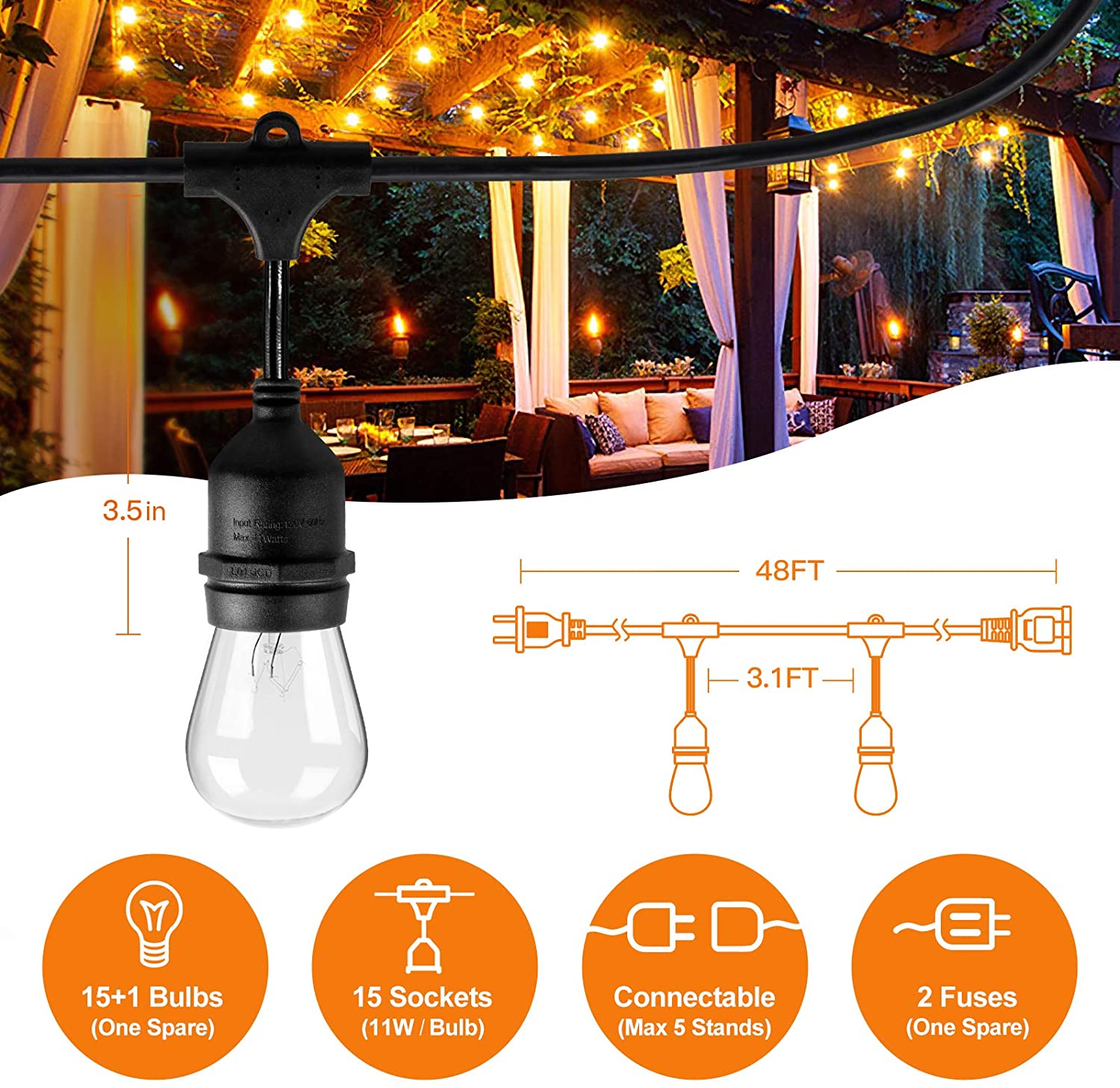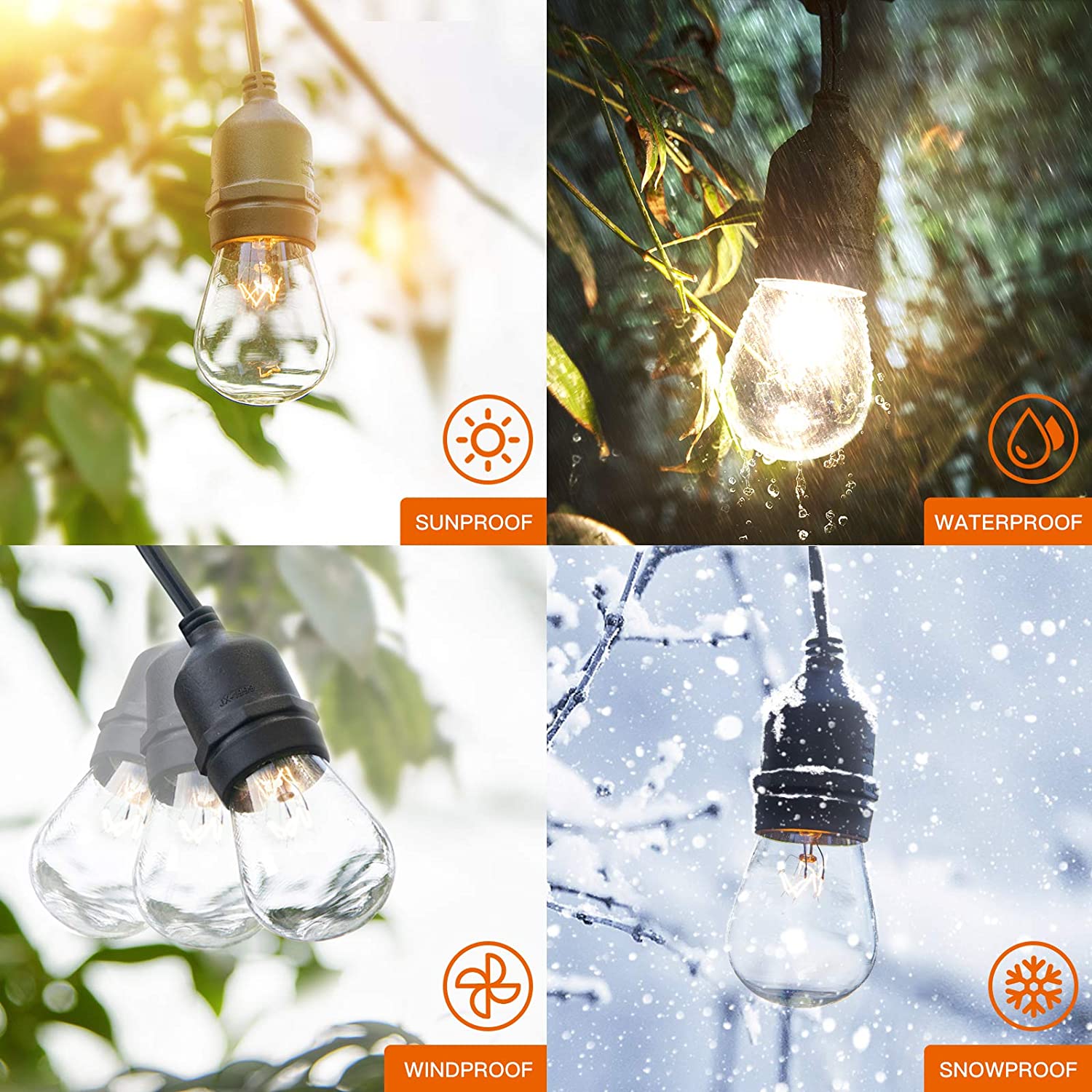 FUNCTIONAL USE: Our outdoor string garden lights are waterproof and long enough to not worry about length, the combination of bright incandescent light bulbs and soft rubber wires make our string lights have a wider and brighter glow. And the materials we use are safe and durable, which can protect the product from normal use in rainy or humid environments