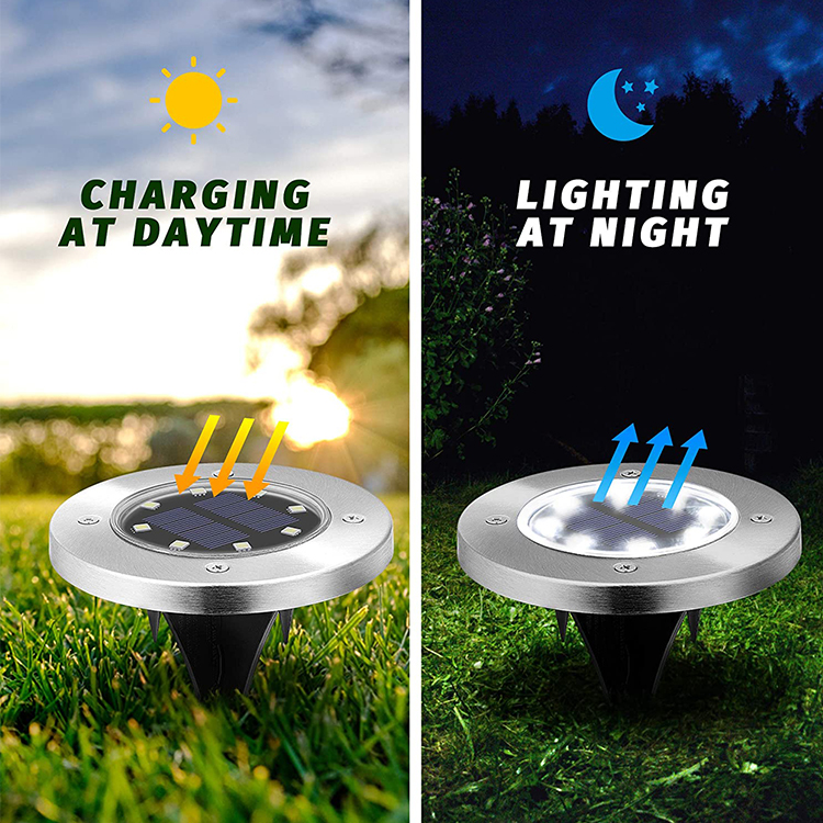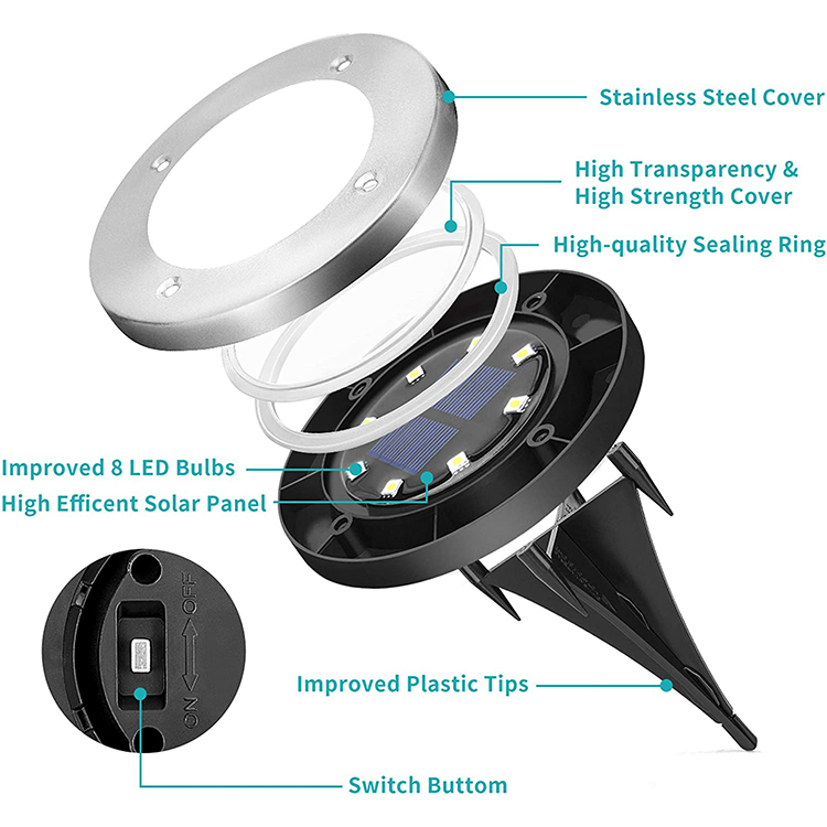 Solar: Our waterproof patio solar garden light is made up of 8 leds. Compared to 6 leds, our light is brighter at night and can last 6-8 hours when fully charged.