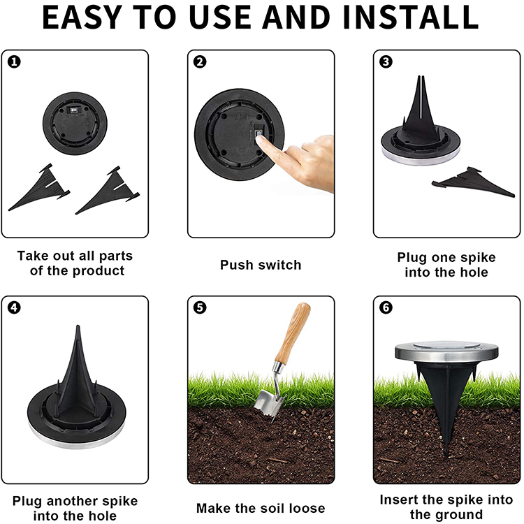 Easy installation: because our waterproof patio solar garden light has a base inserted into the lawn or soil, easy installation, as long as you open the switch, it can automatically light up at night, automatic shutdown in the daytime when there is strong light.
