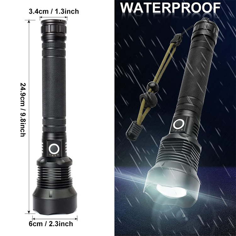 This rechargeable flashlight built-in 2 powerful 26650 batteries ,the maximum output of up to 2500 lumens flashlight LED provides bright light, easily light up an entire room.