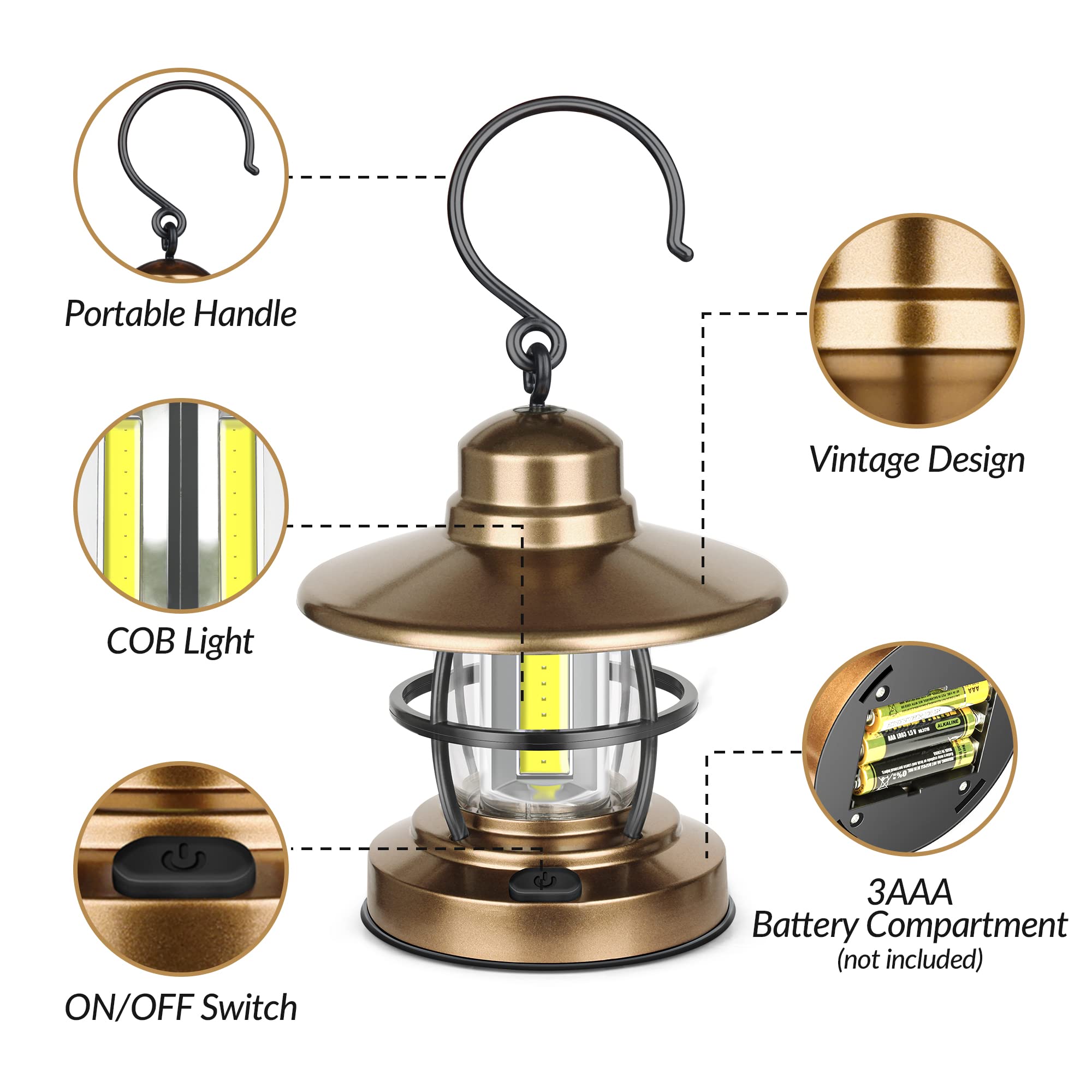 Lantern for camping is made of high-quality bronzed plastic. The retro design of the LED vintage light can add ambiance to your environment and is suitable for garden and party decoration. It looks sophisticated and retro.