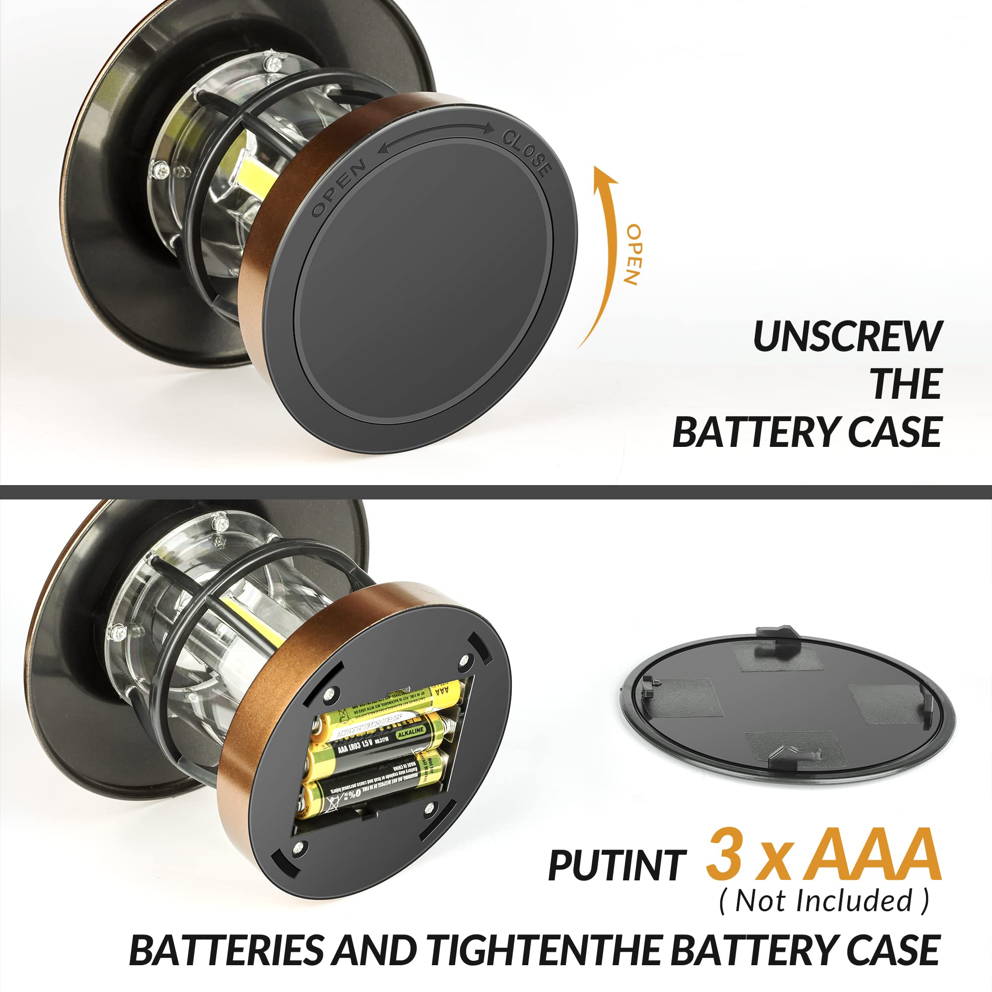 The camping light is powered by 3 AAA batteries(not included). The light adopts a new COB technical, which can produce high brightness up to 1000 LM, providing the most excellent brightness and illuminating the entire camp.