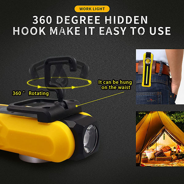 Wholesale Led Magnetic Mechanic Light has three free light sources to address your issues in any occasion.Top Drove spotlight, side round COB yellow floodlight and long COB cold white floodlight.Press and hold the button for three seconds to change to streak mode.Can be utilized as electric lamp, work light, barbecue light,emergency flashlights,etc.The warm white floodlights can likewise be utilized to recognize variety contrasts in vehicle paint