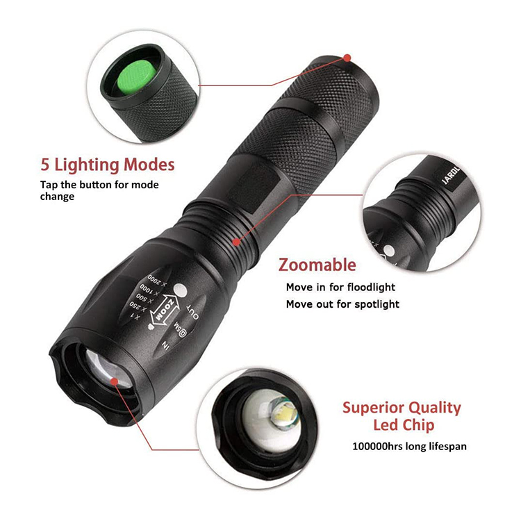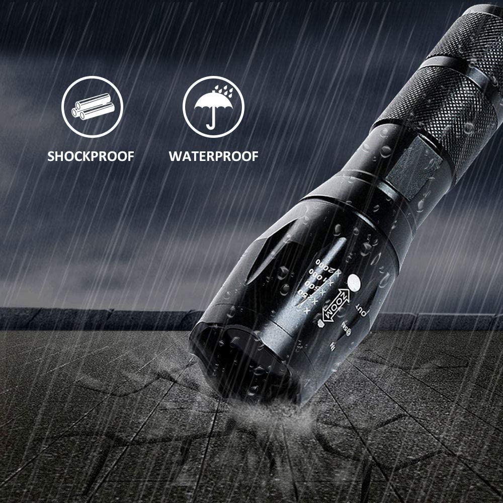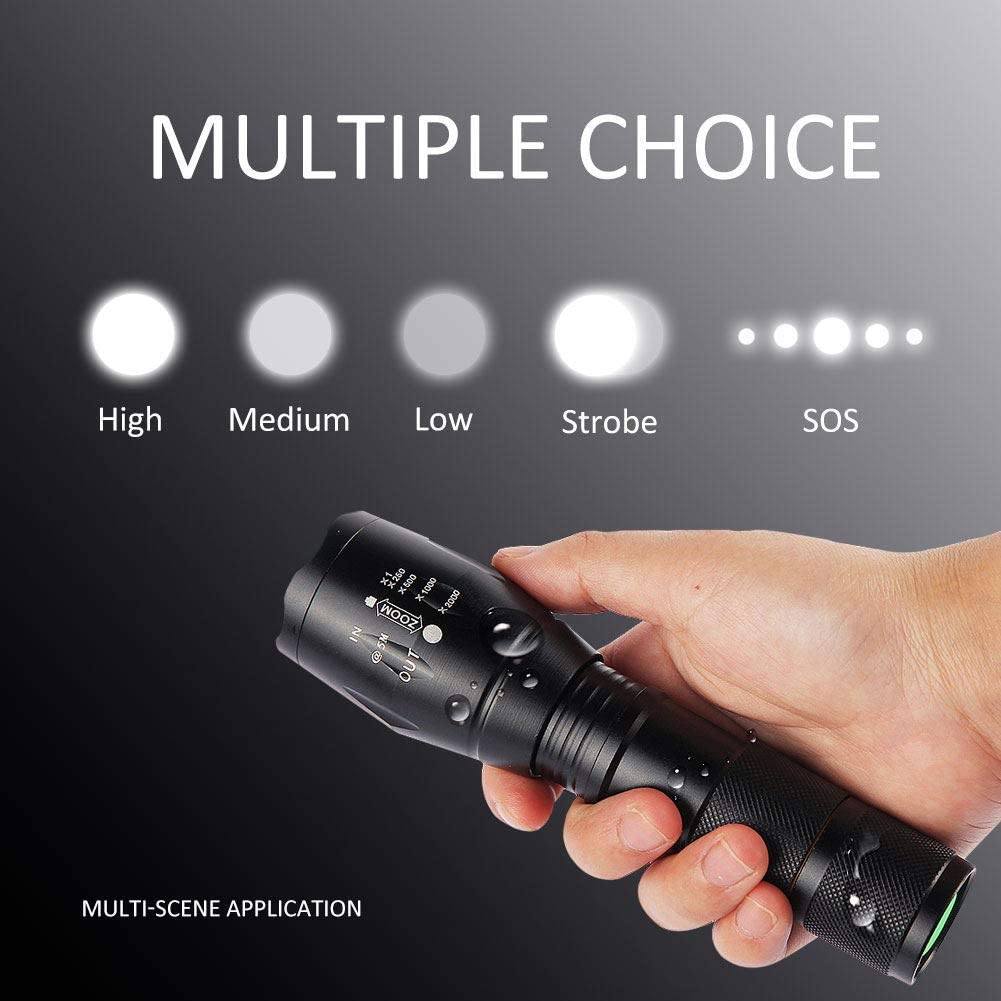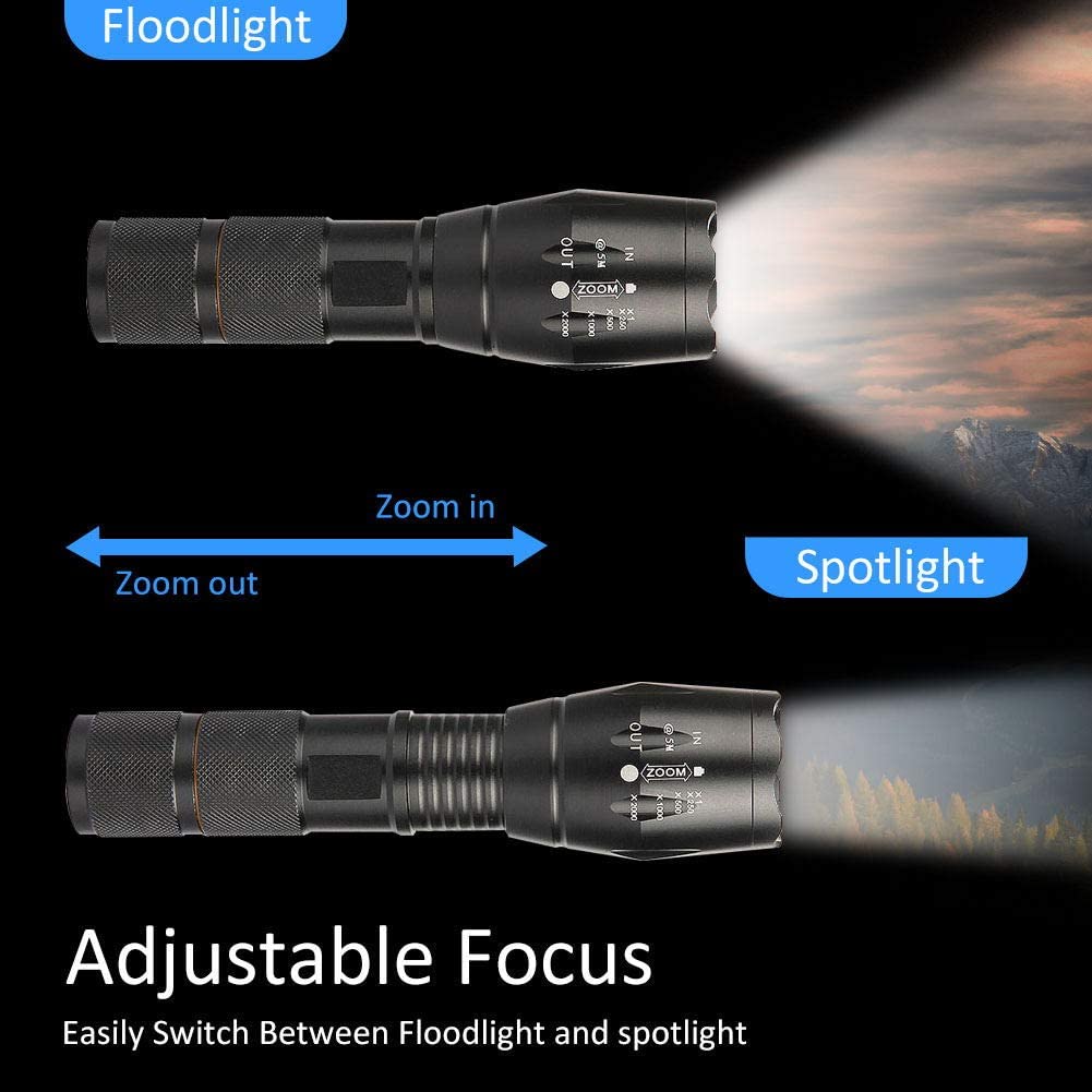【SUPER BRIGHT & LONG-LASTING】 The powerfully Zoomable Waterproof Flashlight provides output up to 900 lumens and a maximum light beam distance of 350 meters, practical for most tasks. Super bright high performance LED flashlight is equipped with high quality of 50,000 hours working life. It is compact enough to fit in your backpack, survival bag, or car glove compartment and suitable for most indoor usage and outdoor activities like camping, fishing, hiking and so on.
